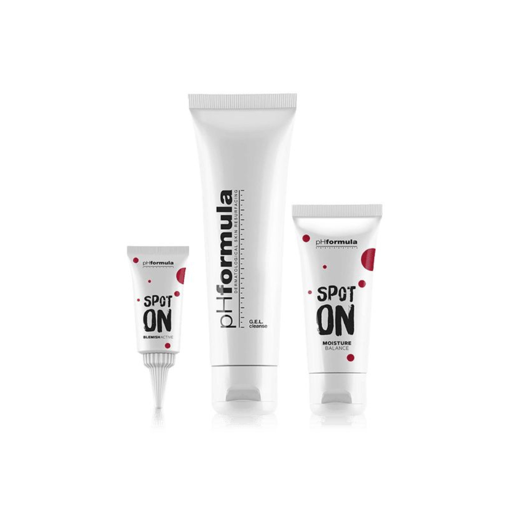Inhoud: 1 G.E.L. cleanse 100ml, 1 SPOT On moisture balance dag-en nachtcrème en 1 SPOT ON blemish active om lokaal de puistjes te behandelen.